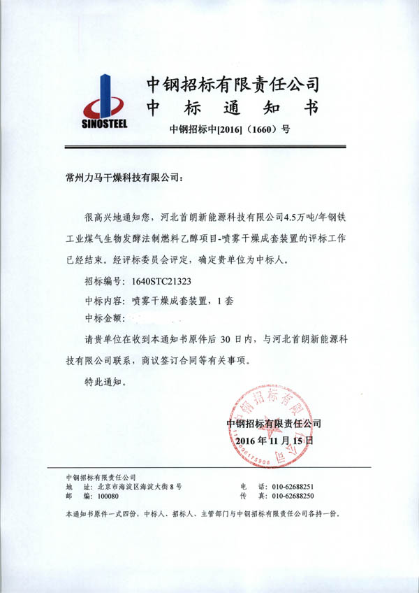 经过公开招标,首钢公司发酵废液的深化处理,转化成蛋白饲料用特大型喷雾干燥机组,最终定标,在众多的参与投标的入围企业中,力马企业一举中标,中标金额巨大。