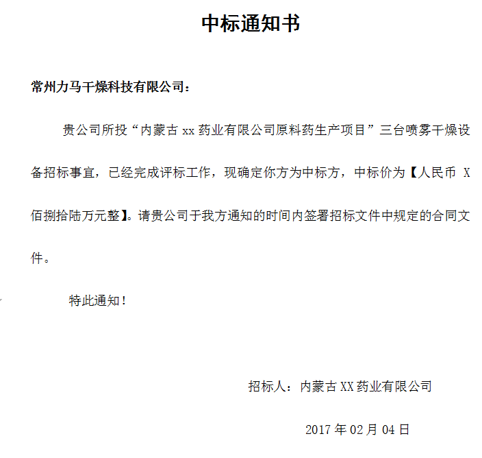 经过广泛的调研和严格的测验,内蒙古xx药业有限公司,最终决定向常州力马科技有限公司定购三台原料药喷雾干燥机,单笔金额高达百万余元,贡献力马新春第一单,为力马赢得了农历鸡年的头彩。同时也展示了内蒙古xx药业有限公司蓬勃的生机和迅猛的发展势头,真诚祝愿两家公司合作愉快、鸡年大吉。
